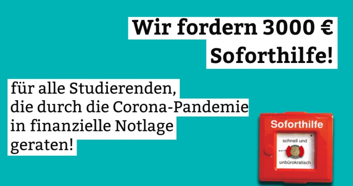 Sofortige finanzielle Unterstützung der Studierenden. Erlass von Semesterbeiträgen- u. Semestertickets, vor allem an privaten Hochschulen. Erlass von Zweitstudiengebühren. Erlass von Mieten, insbesondere von Studierendenwerken. Keine Anrechnung auf BAföG-Laufzeit, sowie auf Prüfungsversuche, sowie auf die Regelstudienzeit. Aufstockung der Lehrkapazitäten für das kommende Winter- und Sommersemester, um ausgefallene Lehrveranstaltungen garantieren zu können.